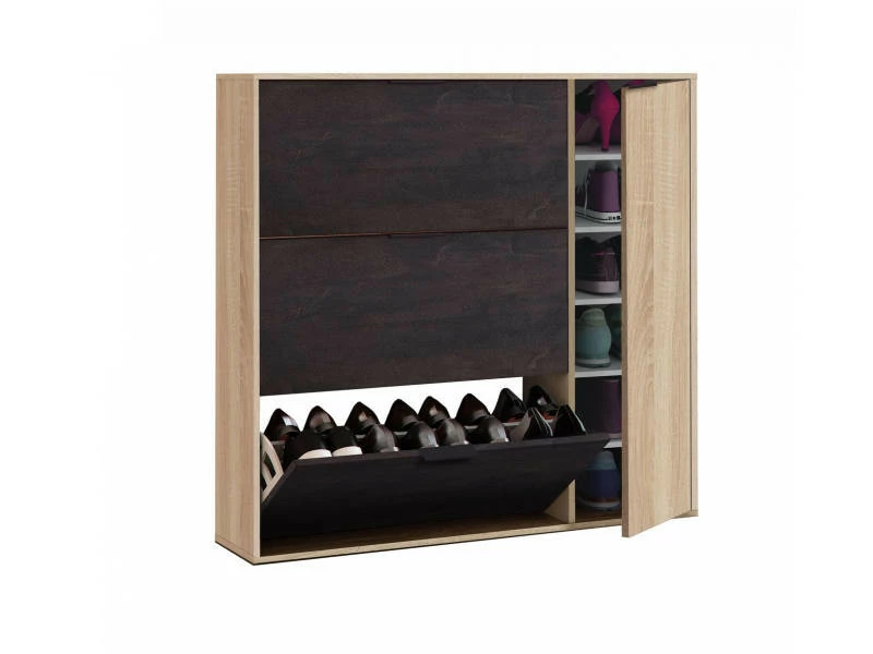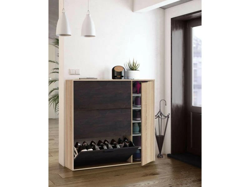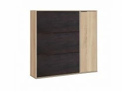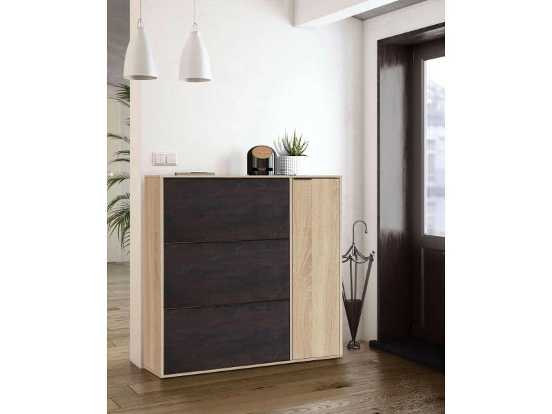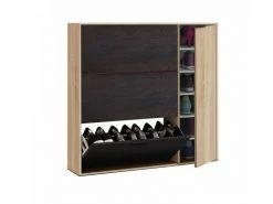 Meuble à chaussures à trois volets et une porte, noir et chêne – Range-chaussures pratique, très polyvalent car il peut être placé dans n’importe quelle pièce de la maison, de la salle de bain au placard, à l’entrée ou sur le balcon. Les portes sont équipées de charnières métalliques. Il peut contenir jusqu’à 30 paires de chaussures – Sa conception aux lignes simples permet un placement facile sans envahir l’espace qui l’abrite. Entièrement fabriqué en stratifié, il est étanche, résistant aux chocs et aux rayures et est durable dans le temps. Dimensions en cm : 106 x 115 x 22