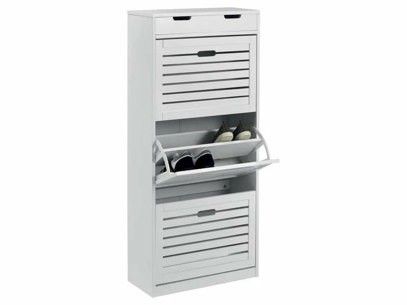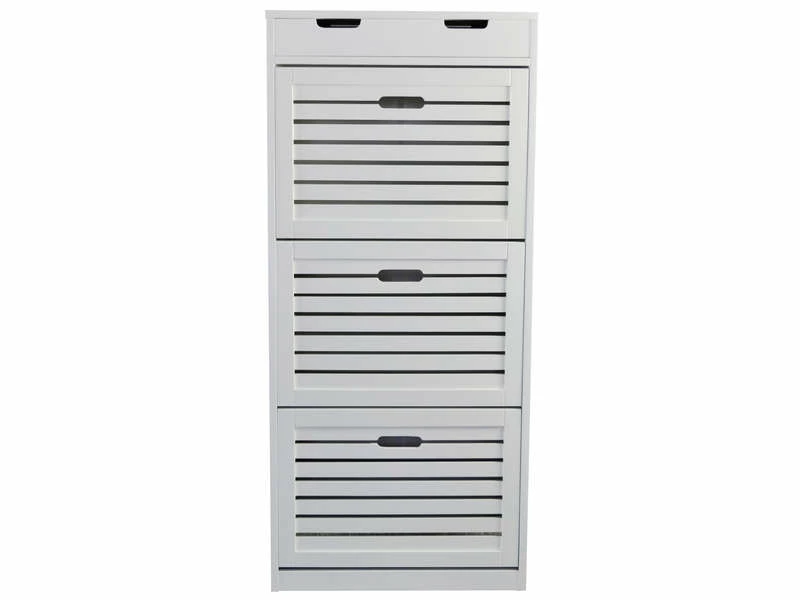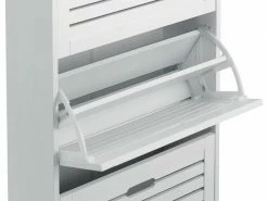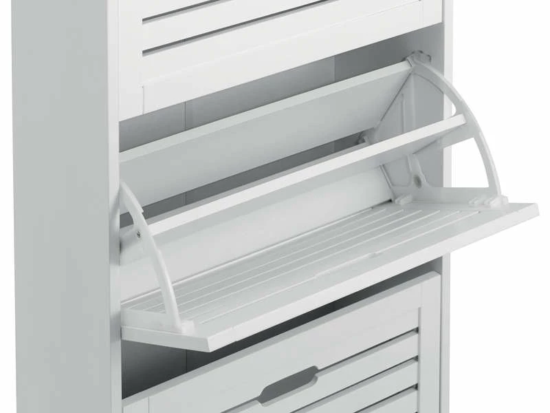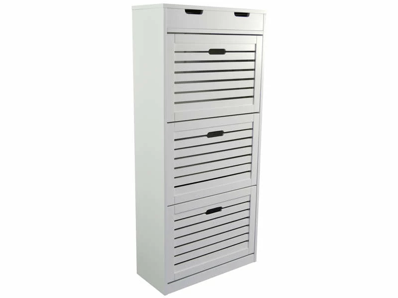 Avec ses abattants effets persiennes, le meuble à chaussures GLORIA apporte un style bord de mer à votre entrée. Ce design original s’assortira aisément à des éléments de déco marins ou à des meubles blancs, un coloris intemporel. Grâce à sa faible profondeur, ce meuble est idéal dans une entrée, dans un couloir ou même dans une chambre. Le meuble à chaussures GLORIA peut accueillir 12 de vos paires de chaussures favorites. Il est également muni d’1 abattant sur le dessus pour ranger quelques accessoires.