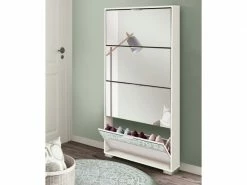 Meuble à chaussures, en panneaux de particules et mélamine haute densité coloris blanc brillant, avec 4 portes battantes avec miroirs. Capacité de rangement environ 16 paires de chaussures. Poignées en plastique ABS finition aluminium. Seulement 17cm de profondeur. Quincaillerie à fixer au mur inclus. Pieds en plastique ABS peint en aluminium mat (Hauteur : 3cm). Produit de fabrication Espagnol certifié PEFC. Livré en kit. Dimensions : Hauteur 153 x Longueur 74 x Profondeur 17 cm Matière : panneaux de particules et mélamine haute densité Coloris : blanc brillant Poids : 34 kg