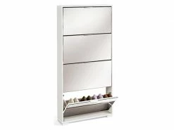 Meuble à chaussures, en panneaux de particules et mélamine haute densité coloris blanc brillant, avec 4 portes battantes avec miroirs. Capacité de rangement environ 16 paires de chaussures. Poignées en plastique ABS finition aluminium. Seulement 17cm de profondeur. Quincaillerie à fixer au mur inclus. Pieds en plastique ABS peint en aluminium mat (Hauteur : 3cm). Produit de fabrication Espagnol certifié PEFC. Livré en kit. Dimensions : Hauteur 153 x Longueur 74 x Profondeur 17 cm Matière : panneaux de particules et mélamine haute densité Coloris : blanc brillant Poids : 34 kg