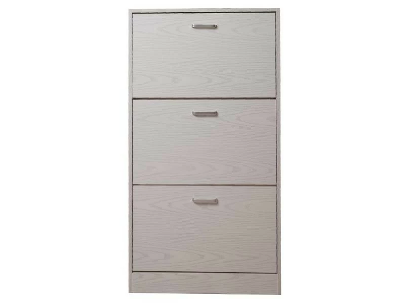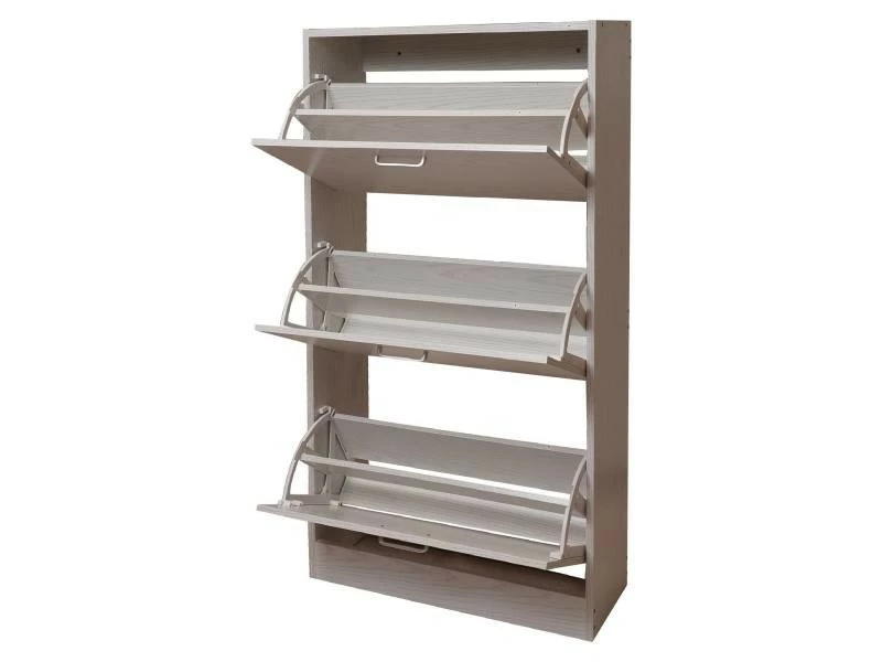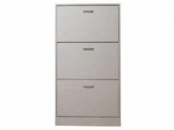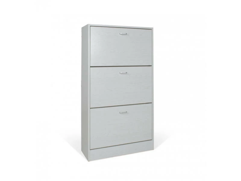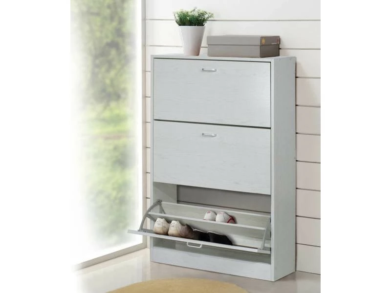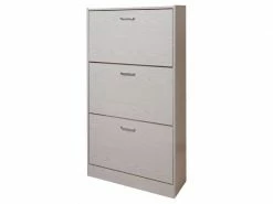 Meuble à chaussures avec trois portes abattantes à double contenance, entièrement de couleur chêne blanchi : les portes ont une petite poignée pour faciliter l’ouverture. Solution parfaite pratique et élégante s’il est placé dans un environnement moderne, il est très spacieux grâce à la structure avec des portes à rabat et avec une double capacité, vous pouvez placer jusqu’à 24 paires de chaussures, c’est une excellente solution peu encombrante. Grâce à son épaisseur réduite, il est idéal si placé à l’entrée, dans un couloir ou même derrière une porte. La production 100% italienne garantit fiabilité, résistance, confort et durabilité dans le temps : l’attention portée aux processus de production, le choix de matières premières de qualité et le souci du détail font de ce produit une fabrication noble. Entièrement réalisé en stratifié, il résiste aux chocs et aux rayures et est durable dans le temps, très facile à nettoyer – Dimensions en cm : 63x24h115