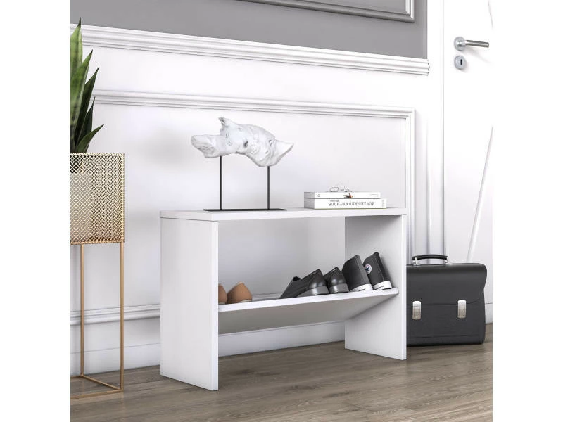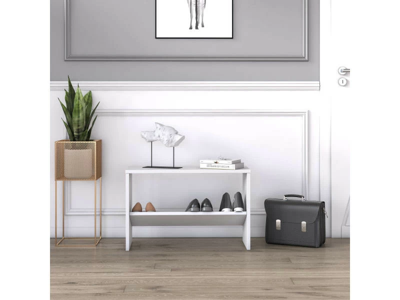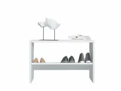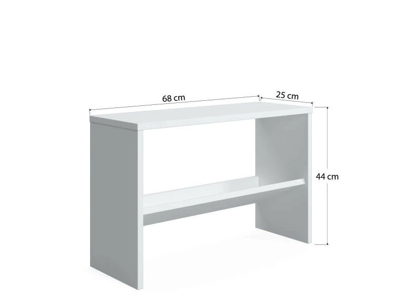 Meuble à chaussures pratique et élégant avec siège essentiel et une étagère inférieure où vous pouvez discrètement placer vos chaussures. Grâce à sa petite taille, il est parfait pour être placé dans des pièces nécessitant de l’espace, par exemple dans un couloir, dans un placard ou derrière une porte. Ses lignes simples et modernes et sa couleur blanche lui permettent d’être placé dans tout type d’environnement. Entièrement construit en aggloméré mélaminé, il est durable dans le temps et résistant aux chocs et rayures. Dimensions en cm : 68 x 25 x 44