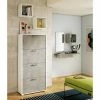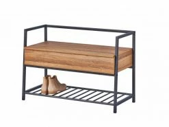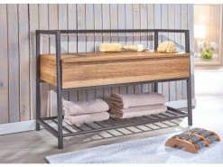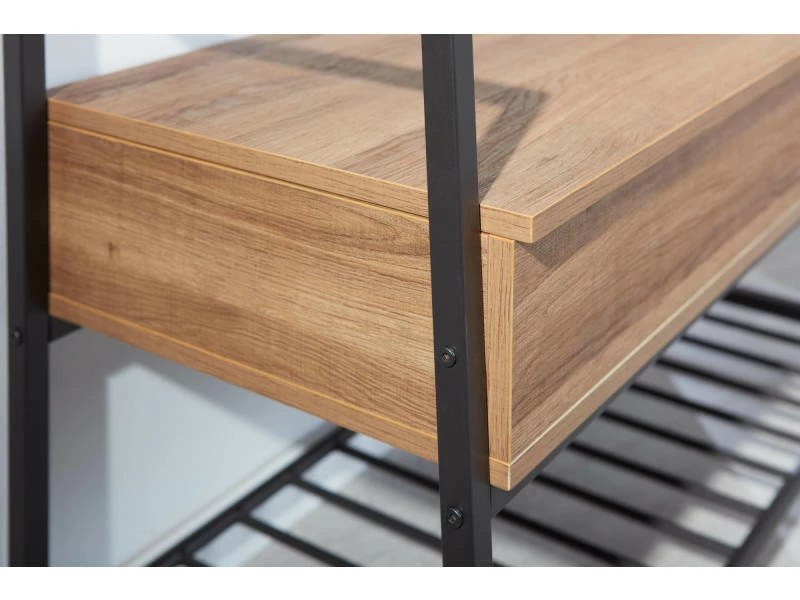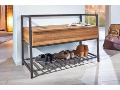 Meuble à chaussures avec conteneur en mélaminé couleur chêne avec structure et étagère en métal noir. Idéal dans l’entrée ou le couloir, il peut également être utilisé dans la chambre ou la salle de bain. Polyvalent grâce au conteneur qui permet le positionnement de divers objets. Étagère à chaussures au design simple et moderne, avec des matériaux résistants et durables. Dimensions : 90x39x61 cm