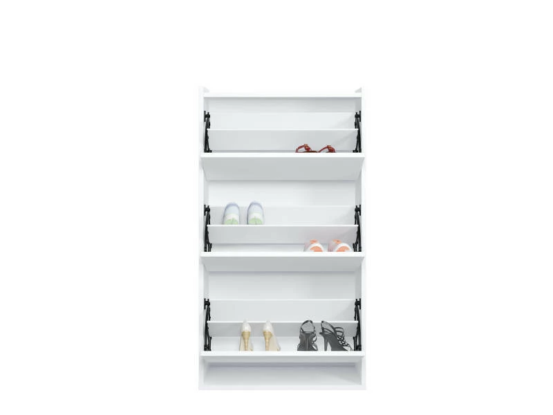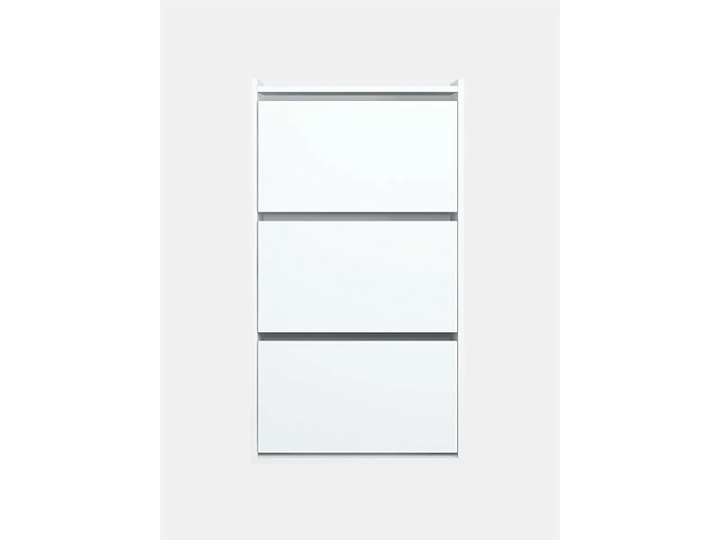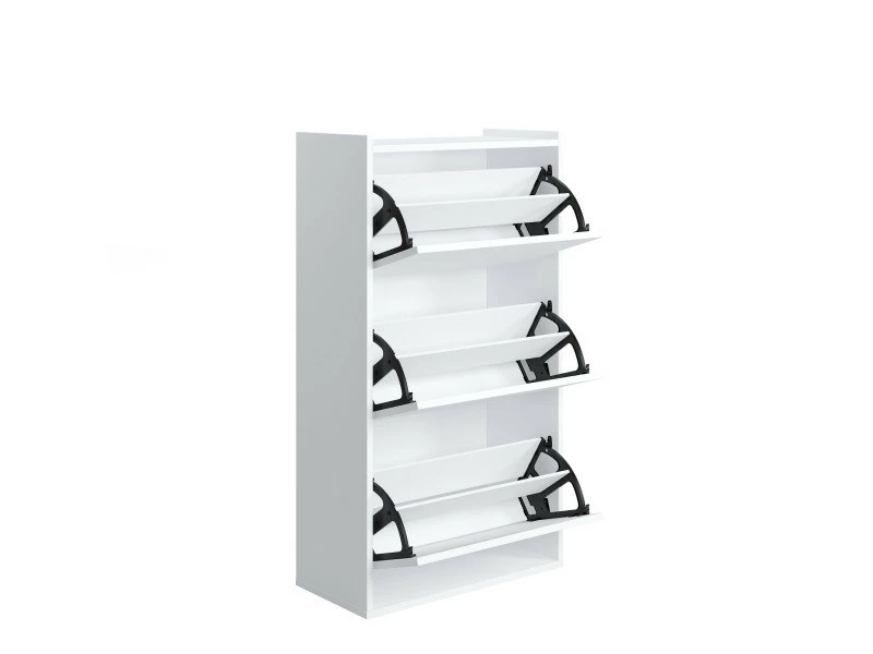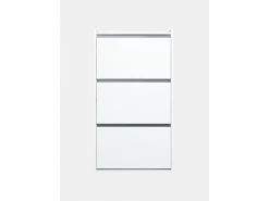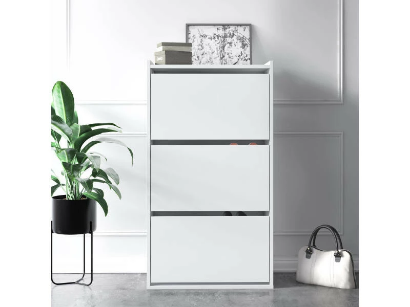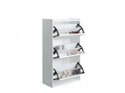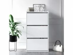 Étagère Ă chaussures Ă©lĂ©gante avec trois portes abattantes confortables : chaque porte est une structure avec deux Ă©tagères et Ă l’intĂ©rieur elle peut contenir jusqu’Ă six paires de chaussures, soit un total de dix-huit pour toute la structure. Grâce Ă sa petite taille, il est parfait pour ĂŞtre placĂ© dans des pièces nĂ©cessitant de l’espace, par exemple dans un couloir, dans un placard ou derrière une porte. Ses lignes simples et modernes et sa couleur blanche lui permettent d’ĂŞtre placĂ© dans tout type d’environnement. Entièrement construit en agglomĂ©rĂ© mĂ©laminĂ©, il est durable dans le temps et rĂ©sistant aux chocs et rayures. Dimensions en cm : 65 x 32 x 11,8
