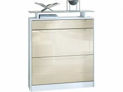 Meuble de rangement : Avec sa tablette en verre, cette armoire à chaussures ingénieuse comprend 2 clapets avec doubles supports à chaussures accueillant jusqu’à 16 paires de chaussures et divers accessoires. Ouverture : L’étagère à chaussures est munie de discrètes poignées argent. Pour un maniement aisé, les tiroirs de la commode sont montés sur des rails télescopiques en métal qui glissent silencieusement. Design : Le caisson de la commode à chaussures en blanc mat et les façades en crème haute brillance avec les contrastes en crème haute brillance créent une ambiance moderne et chaleureuse. Matériaux : Les façades en MDF stratifié haut de gamme et le caisson en panneaux agglomérés avec revêtement mélaminé en font un meuble à la fois léger, et facile d’entretien. Contenu de la livraison : La livraison comprend le meuble à chaussure, la tablette en verre, le matériel de montage, et la notice. Dimensions du meuble rangement pour chaussures en cm (LxHxP) : 89 x 104 x 23