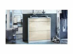 Meuble de rangement : Avec sa tablette en verre, cette armoire à chaussures ingénieuse comprend 2 clapets avec doubles supports à chaussures accueillant jusqu’à 16 paires de chaussures et divers accessoires. Ouverture : L’étagère à chaussures est munie de discrètes poignées argent. Pour un maniement aisé, les tiroirs de la commode sont montés sur des rails télescopiques en métal qui glissent silencieusement. Design : Le caisson de la commode à chaussures en blanc mat et les façades en crème haute brillance avec les contrastes en crème haute brillance créent une ambiance moderne et chaleureuse. Matériaux : Les façades en MDF stratifié haut de gamme et le caisson en panneaux agglomérés avec revêtement mélaminé en font un meuble à la fois léger, et facile d’entretien. Contenu de la livraison : La livraison comprend le meuble à chaussure, la tablette en verre, le matériel de montage, et la notice. Dimensions du meuble rangement pour chaussures en cm (LxHxP) : 89 x 104 x 23