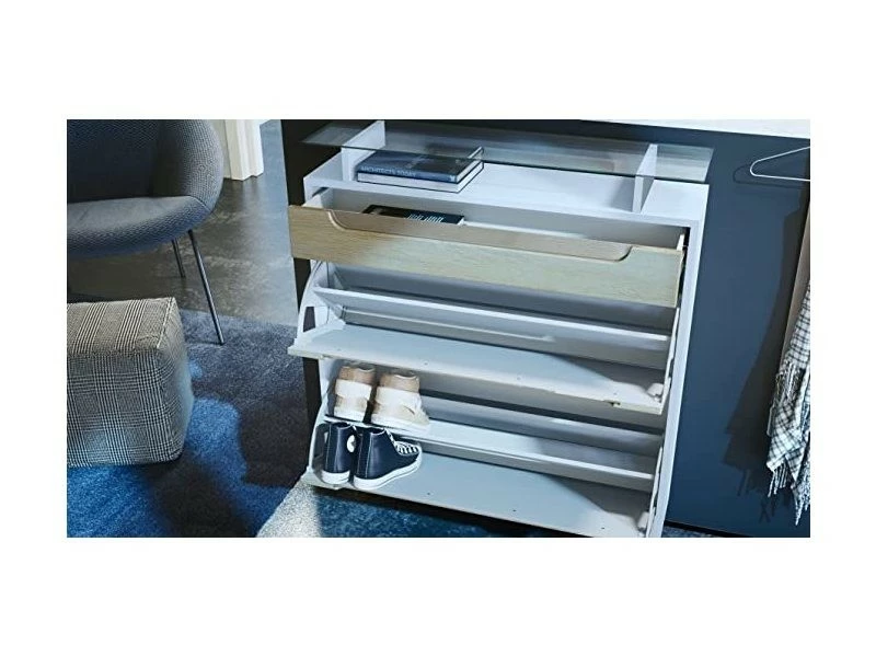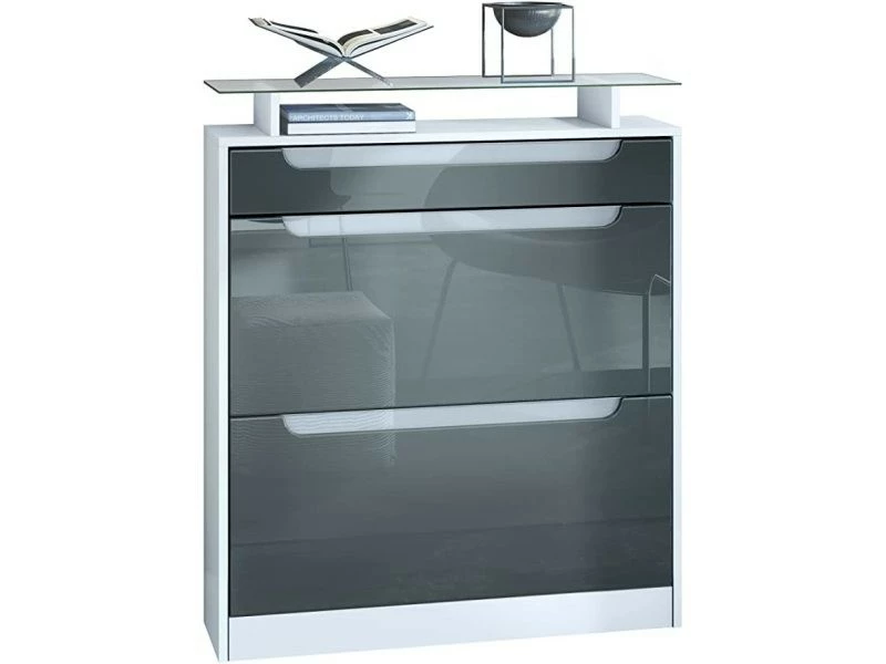Meuble de rangement : Avec sa tablette en verre, cette armoire à chaussures ingénieuse comprend 2 clapets avec doubles supports à chaussures accueillant jusqu’à 16 paires de chaussures et divers accessoires. Ouverture : L’étagère à chaussures est munie de discrètes poignées argent. Pour un maniement aisé, les tiroirs de la commode sont montés sur des rails télescopiques en métal qui glissent silencieusement. Design : Le caisson de la commode à chaussures en blanc mat et les façades en Gris haute brillance avec les contrastes en Blanc haute brillance créent une ambiance moderne et chaleureuse. Matériaux : Les façades en MDF stratifié haut de gamme et le caisson en panneaux agglomérés avec revêtement mélaminé en font un meuble à la fois léger, et facile d’entretien. Contenu de la livraison : La livraison comprend le meuble à chaussure, la tablette en verre, le matériel de montage, et la notice. Dimensions du meuble rangement pour chaussures en cm (LxHxP) : 89 x 104 x 23