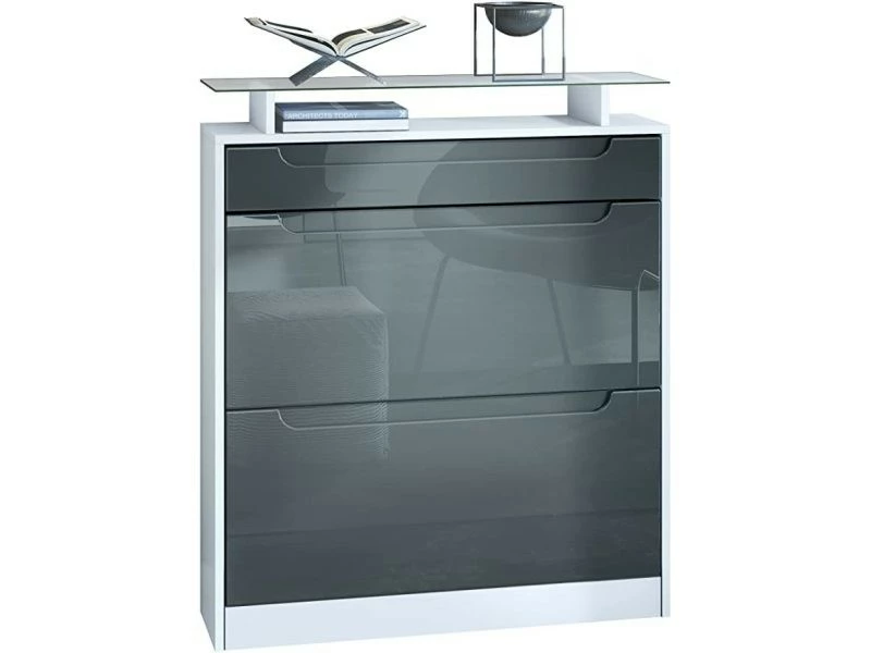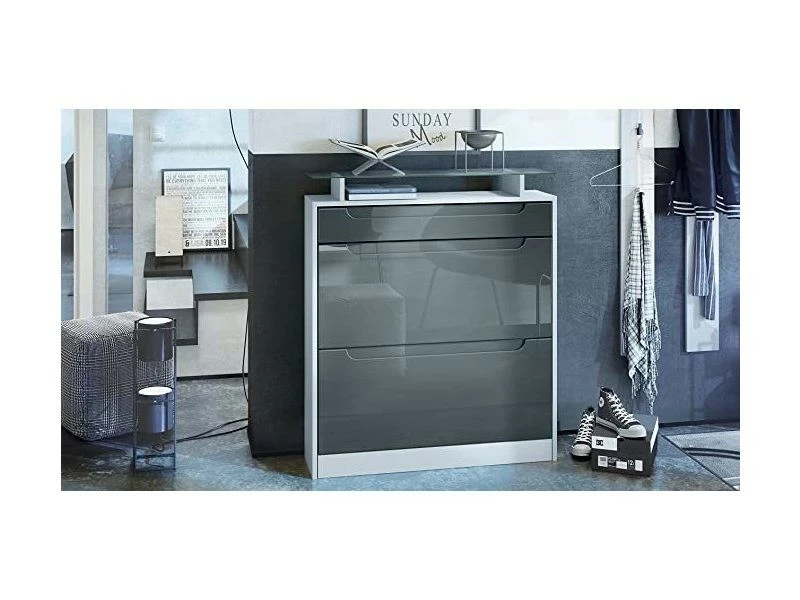 Meuble de rangement : Avec sa tablette en verre, cette armoire à chaussures ingénieuse comprend 2 clapets avec doubles supports à chaussures accueillant jusqu’à 16 paires de chaussures et divers accessoires. Ouverture : L’étagère à chaussures est munie de discrètes poignées argent. Pour un maniement aisé, les tiroirs de la commode sont montés sur des rails télescopiques en métal qui glissent silencieusement. Design : Le caisson de la commode à chaussures en blanc mat et les façades en Gris haute brillance avec les contrastes en Gris haute brillance créent une ambiance moderne et chaleureuse. Matériaux : Les façades en MDF stratifié haut de gamme et le caisson en panneaux agglomérés avec revêtement mélaminé en font un meuble à la fois léger, et facile d’entretien. Contenu de la livraison : La livraison comprend le meuble à chaussure, la tablette en verre, le matériel de montage, et la notice. Dimensions du meuble rangement pour chaussures en cm (LxHxP) : 89 x 104 x 23