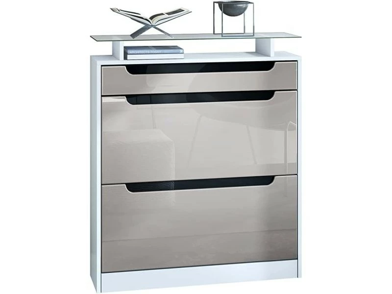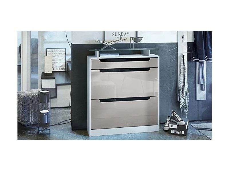 Meuble de rangement : Avec sa tablette en verre, cette armoire à chaussures ingénieuse comprend 2 clapets avec doubles supports à chaussures accueillant jusqu’à 16 paires de chaussures et divers accessoires. Ouverture : L’étagère à chaussures est munie de discrètes poignées argent. Pour un maniement aisé, les tiroirs de la commode sont montés sur des rails télescopiques en métal qui glissent silencieusement. Design : Le caisson de la commode à chaussures en blanc mat et les façades en Gris sable haute brillance avec les contrastes en Noir haute brillance créent une ambiance moderne et chaleureuse. Matériaux : Les façades en MDF stratifié haut de gamme et le caisson en panneaux agglomérés avec revêtement mélaminé en font un meuble à la fois léger, et facile d’entretien. Contenu de la livraison : La livraison comprend le meuble à chaussure, la tablette en verre, le matériel de montage, et la notice. Dimensions du meuble rangement pour chaussures en cm (LxHxP) : 89 x 104 x 23