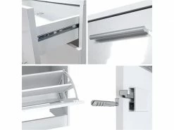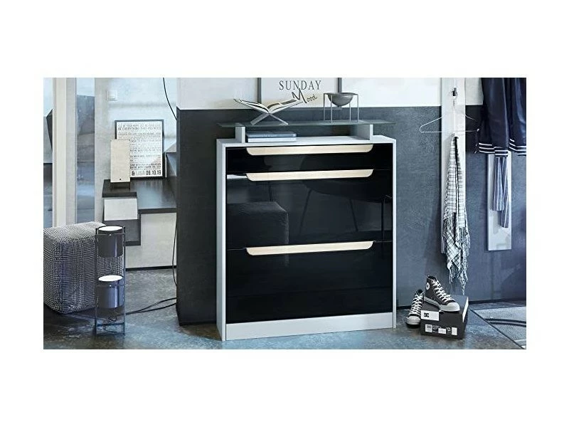 Meuble de rangement : Avec sa tablette en verre, cette armoire à chaussures ingénieuse comprend 2 clapets avec doubles supports à chaussures accueillant jusqu’à 16 paires de chaussures et divers accessoires. Ouverture : L’étagère à chaussures est munie de discrètes poignées argent. Pour un maniement aisé, les tiroirs de la commode sont montés sur des rails télescopiques en métal qui glissent silencieusement. Design : Le caisson de la commode à chaussures en blanc mat et les façades en Noir haute brillance avec les contrastes en Crème haute brillance créent une ambiance moderne et chaleureuse. Matériaux : Les façades en MDF stratifié haut de gamme et le caisson en panneaux agglomérés avec revêtement mélaminé en font un meuble à la fois léger, et facile d’entretien. Contenu de la livraison : La livraison comprend le meuble à chaussure, la tablette en verre, le matériel de montage, et la notice. Dimensions du meuble rangement pour chaussures en cm (LxHxP) : 89 x 104 x 23