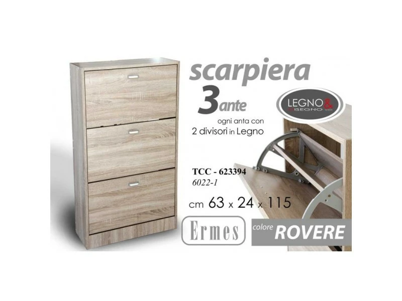 Meuble Ă chaussures en chĂŞne Ă trois rabats avec deux diviseurs cm 63 x 24 x 115 h En kit Ă assembler