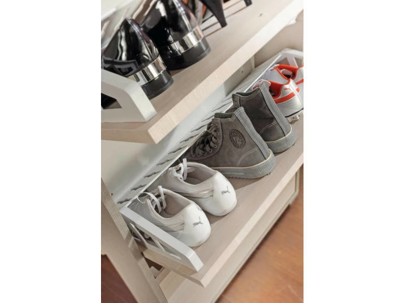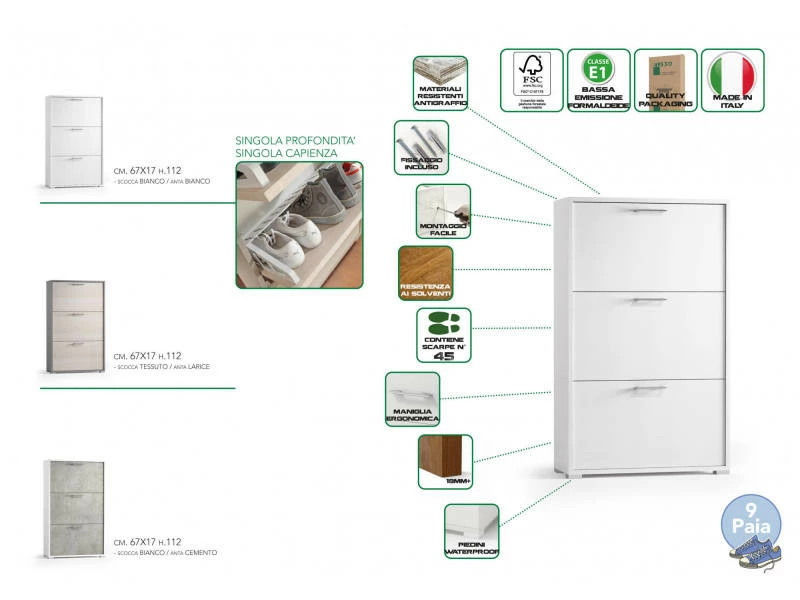 SHOE RACK – étagère à chaussures pratique avec 3 conteneurs à rabat, parfait pour n’importe quelle pièce de votre maison, s’adapte à tous les besoins personnels, couleur mélèze. STRUCTURE ET UTILISATION – Armoire classique parfaite pour ranger soigneusement vos chaussures, peut être placée dans le placard, à l’entrée ou comme meuble dans la chambre – Équipée de 3 portes à rabat pouvant contenir confortablement jusqu’à 9 paires de chaussures. PRATIQUE ET INNOVANT – Structure aux lignes classiques, il peut être positionné dans n’importe quel coin de la maison grâce à sa petite taille, équipé de poignées pratiques pour faciliter l’ouverture – Pratique gain de place. 100% MADE IN ITALY – La production 100% italienne garantit fiabilité, résistance, confort et durabilité dans le temps l’attention portée aux processus de production, le choix de matières premières de qualité et le souci du détail font de ce produit une fabrication noble. CARACTÉRISTIQUES TECHNIQUES – Entièrement construit en panneau mélaminé thermostructuré E1, plateaux en matière plastique, il résiste aux chocs et aux rayures, et est durable dans le temps – Nettoyage facile et rapide grâce au matériau qui le compose – Livré démonté avec kit et livret d’instructions assemblage – Soin et attention particulière aux emballages, résistants et adaptés au transport – Bois certifié FSC, l’épaisseur de 18 mm garantit une haute résistance des matériaux, un rendement esthétique élevé grâce à la finition très haute définition – Dimensions en cm – 67x18x112
