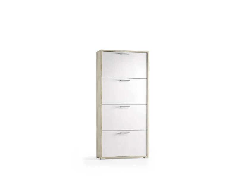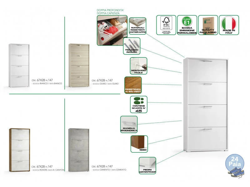 SHOE RACK – étagère à chaussures pratique avec 4 conteneurs à rabat à double profondeur, parfait pour chaque pièce de votre maison, il s’adapte à tous les besoins personnels, couleur orme et portes blanches. STRUCTURE ET UTILISATION – Armoire classique parfaite pour ranger soigneusement vos chaussures, elle peut être placée dans le placard, à l’entrée ou comme meuble dans la chambre – Équipée de 4 portes à rabat pouvant contenir confortablement jusqu’à 24 paires de chaussures grâce à sa double profondeur. PRATIQUE ET INNOVANT – Structure aux lignes classiques, il peut être positionné dans n’importe quel coin de la maison grâce à sa petite taille, équipé de poignées pratiques pour faciliter l’ouverture – Pratique gain de place. 100% MADE IN ITALY – La production 100% italienne garantit fiabilité, résistance, confort et durabilité dans le temps l’attention portée aux processus de production, le choix de matières premières de qualité et le souci du détail font de ce produit une fabrication noble. CARACTÉRISTIQUES TECHNIQUES – Entièrement construit en panneau mélaminé thermostructuré E1, plateaux en matière plastique, il résiste aux chocs et aux rayures, et est durable dans le temps – Nettoyage facile et rapide grâce au matériau qui le compose – Livré démonté avec kit et livret d’instructions assemblage – Soin et attention particulière aux emballages, résistants et adaptés au transport – Bois certifié FSC, l’épaisseur de 18 mm garantit une haute résistance des matériaux, un rendement esthétique élevé grâce à la finition très haute définition – Dimensions en cm – 67x28x147