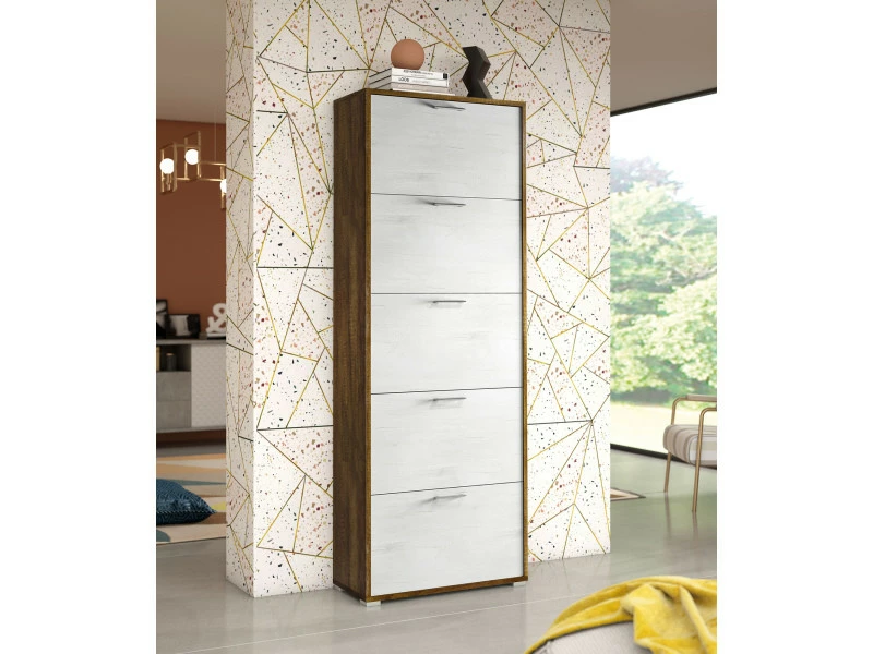SHOE RACK – meuble à chaussures pratique avec 5 conteneurs à rabats à double profondeur, parfait pour chaque pièce de votre maison, il s’adapte à tous les besoins personnels, couleur chêne foncé et portes blanc canyon. STRUCTURE ET UTILISATION – Armoire classique parfaite pour ranger soigneusement vos chaussures, elle peut être placée dans le placard, à l’entrée ou comme meuble dans la chambre – Équipée de 4 portes à rabat pouvant contenir confortablement jusqu’à 30 paires de chaussures grâce à sa double profondeur. PRATIQUE ET INNOVANT – Structure aux lignes classiques, il peut être positionné dans n’importe quel coin de la maison grâce à sa petite taille, équipé de poignées pratiques pour faciliter l’ouverture – Pratique gain de place. 100% MADE IN ITALY – La production 100% italienne garantit fiabilité, résistance, confort et durabilité dans le temps l’attention portée aux processus de production, le choix de matières premières de qualité et le souci du détail font de ce produit une fabrication noble. CARACTÉRISTIQUES TECHNIQUES – Entièrement construit en panneau mélaminé thermostructuré E1, plateaux en matière plastique, il résiste aux chocs et aux rayures, et est durable dans le temps – Nettoyage facile et rapide grâce au matériau qui le compose – Livré démonté avec kit et livret d’instructions assemblage – Soin et attention particulière aux emballages, résistants et adaptés au transport – Bois certifié FSC, l’épaisseur de 18 mm garantit une haute résistance des matériaux, un rendement esthétique élevé grâce à la finition très haute définition – Dimensions en cm – 67x28x183