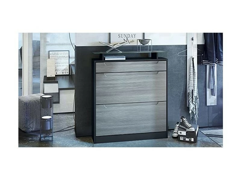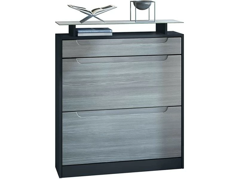 Meuble de rangement : Avec sa tablette en verre, cette armoire à chaussures ingénieuse comprend 2 clapets avec doubles supports à chaussures accueillant jusqu’à 16 paires de chaussures et divers accessoires. Ouverture : L’étagère à chaussures est munie de discrètes poignées argent. Pour un maniement aisé, les tiroirs de la commode sont montés sur des rails télescopiques en métal qui glissent silencieusement. Design : Le caisson de la commode à chaussures en Noir mat et les façades et poignées Avola anthracite mat créent une ambiance moderne et chaleureuse. Matériaux : Les façades en MDF stratifié et le caisson en panneaux agglomérés avec revêtement mélaminé en font un meuble à la fois léger et facile d’entretien. Contenu de la livraison : La livraison comprend le meuble à chaussure, la tablette en verre, le matériel de montage, et la notice. Dimensions du meuble rangement pour chaussures en cm (LxHxP) : 89 x 104 x 23