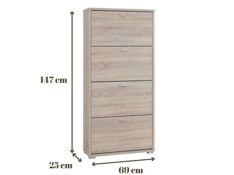 ARMOIRE À CHAUSSURES Cambo 4 Une proposition idéale pour les personnes qui apprécient d’avoir de beaux meubles dans leur appartement. Petit meuble à chaussures. ● 3xEliving Cambo Meuble à chaussures 2 – Meuble à chaussures à deux compartiments, il conviendra à toutes vos chaussures ● L’armoire à chaussures élégante et moderne est la solution idéale pour ceux qui disposent d’un petit espace utilisable dans leur environnement et qui, en même temps, ne veulent pas renoncer à l’ordre et à la propreté des chaussures. ● Marque : 3xEliving ● Couleur : CHÊNE SONOMA ● Dimensions : Hauteur : 149 cm, Largeur : 69 cm, Profondeur : 25 cm ● Matériau : panneau de particules MDF Contenu du colis : ● 1 × Meuble à armoire a chaussures ● 1 × manuel d’utilisation ● Accessoires de montage. MATÉRIEL meuble d entree: Corps et façades – panneaux de particules mélaminés, épaisseur 22 mm. Bords – finis en plastique ABS (caractérisé par une résistance mécanique et chimique élevée) Attention! Avertissement contre les dommages : Pour éviter les rayures, la commode rangement chambre doit être placée sur une surface douce telle qu’un tapis. En raison des paramètres du moniteur, les couleurs du rangement chambre adulte reçu peuvent varier légèrement. Les meubles de salon sont emballés dans des cartons, si vous n’avez aucune expérience dans le montage de meubles, veuillez faire appel à un professionnel. Les meubles de rangement pour salon lors du montage ne font pas l’objet d’une réclamation. Ce meuble de rangement pour salon doit être fixé au mur. Différents types de murs nécessitent différents types de fixations. Utilisez des vis et des boulons adaptés aux murs de votre maison. Ces accessoires ne sont pas inclus avec le produit.