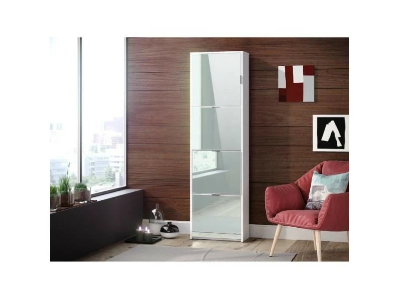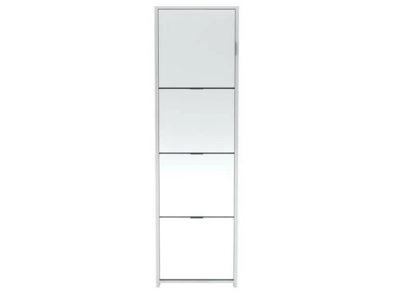 RIMINI Meuble a chaussures en panneaux de particules mĂ©laminĂ©s blanc mat – Style et design contemporain – 4 portes et 4 poignĂ©es en ABS – Miroir sur les façades des portes – De 12 a 18 paires – Fabrication europĂ©enne – Dimensions totales : L 25 x P 52 x H 180 cm.