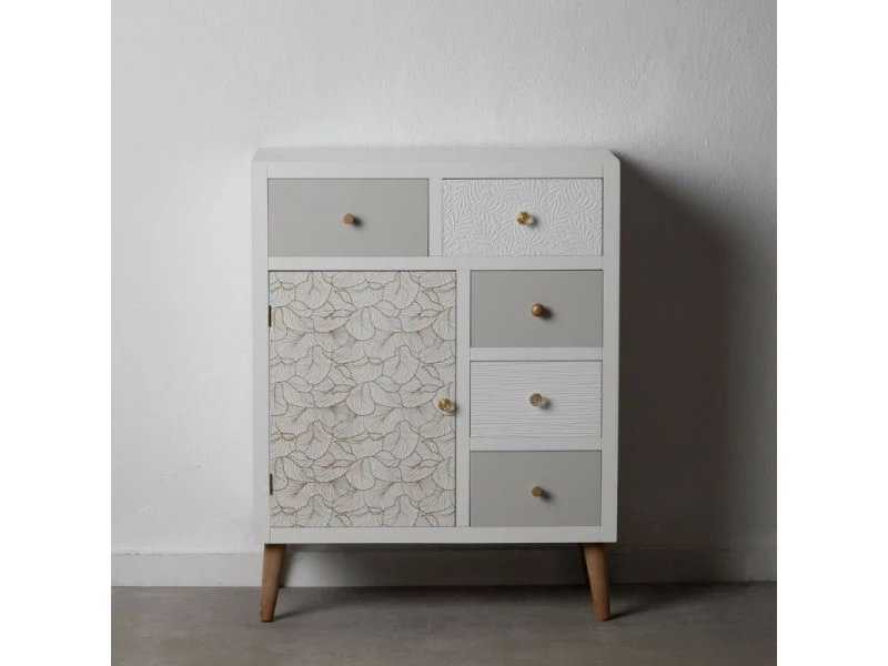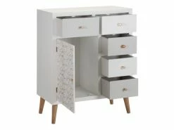 Le mariage d’un corps teinte blanc et de tiroirs aux teintes variées et aux motifs originaux offre à ce meuble une signature visuelle unique qui lui permet de s’associer avec de meubles classiques ou avec des meubles modernes.