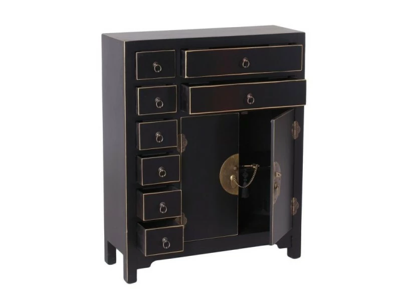 La teinte noire se marie à la quincaillerie dorée, parfaitement raccord avec le style oriental de ce meuble multifonction sobre et élégant.