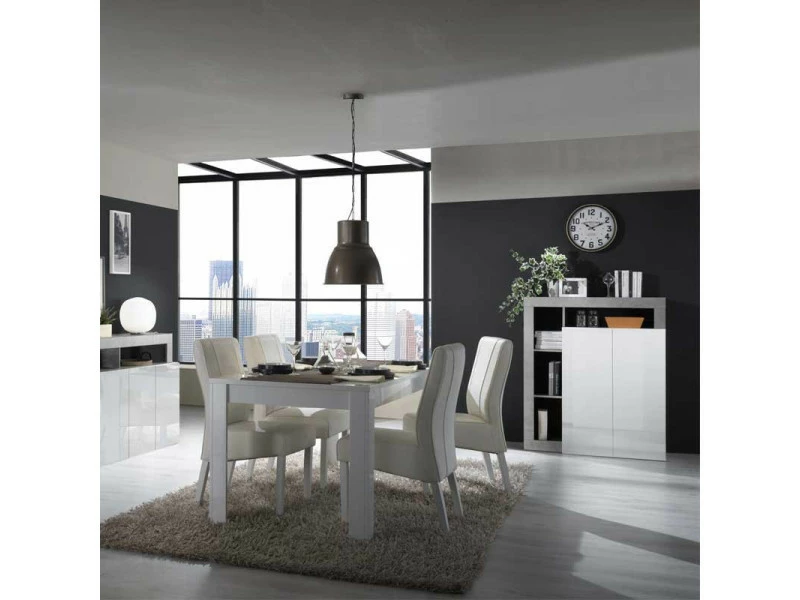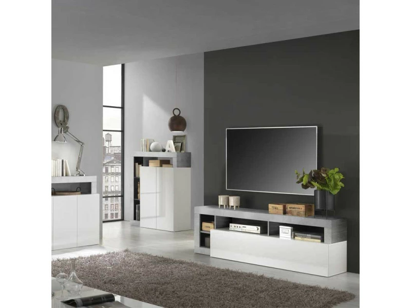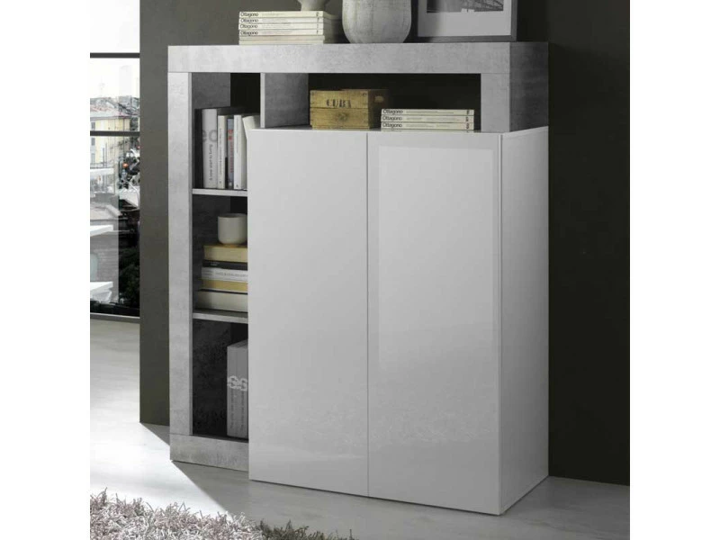 La belle finition béton ciré clair au rendu très probant se marie ici à une laque Blanc brillant, vous pourrez ainsi facilement associer ce meuble de rangement à un mobilier contemporain hétérogène.