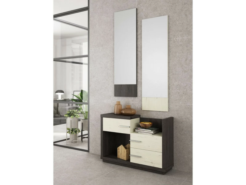 Il est accompagné de deux miroirs modernes quireprennent le code couleur et le dessin de ce meuble d’entrée élégant et exclusif.