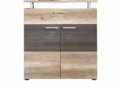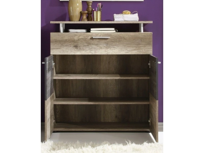 Meuble d’entrée. Meuble à chaussure en mélaminé coloris chêne et gris. L – H – P: 90 – 101 – 37 cm