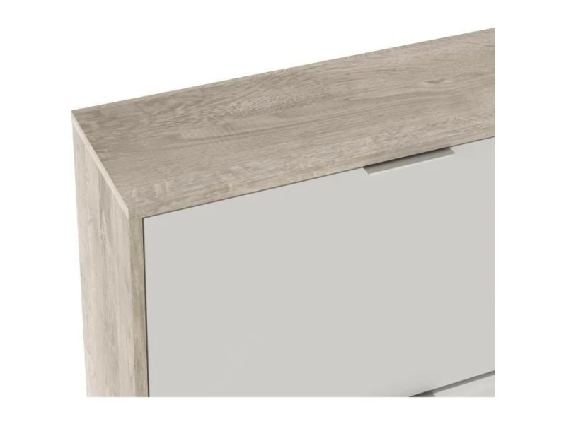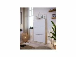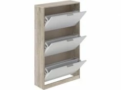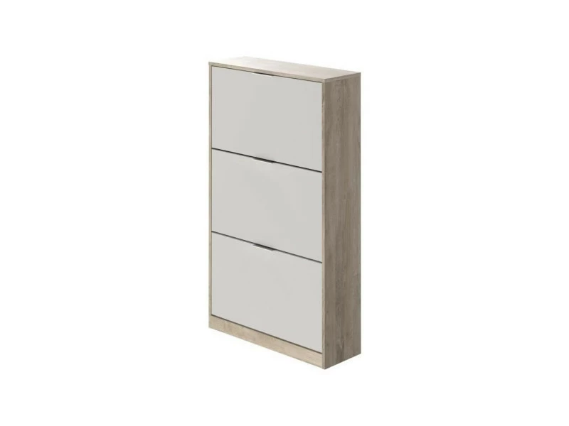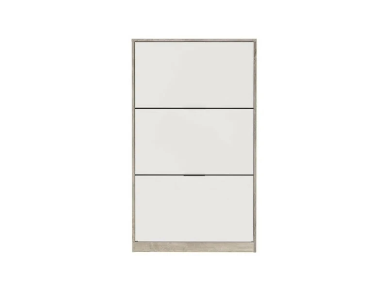 Meuble a chaussures avec 3 portes battantes fabriqué en melamine chene pour le corps du meuble et mélamine blanche pour les portes. Poignées en ABS gris. Capacité 18-24 pairs de chaussures.