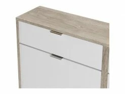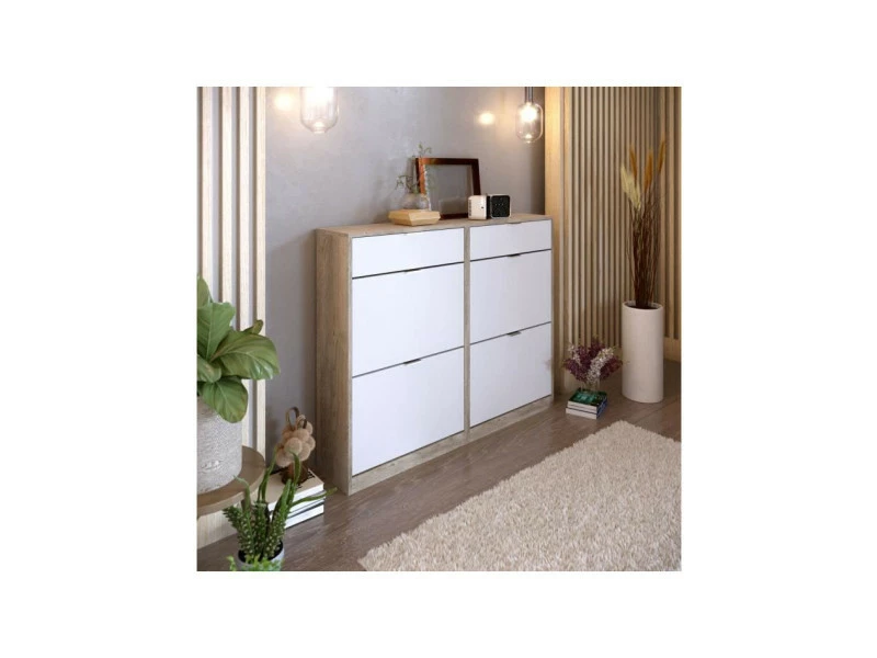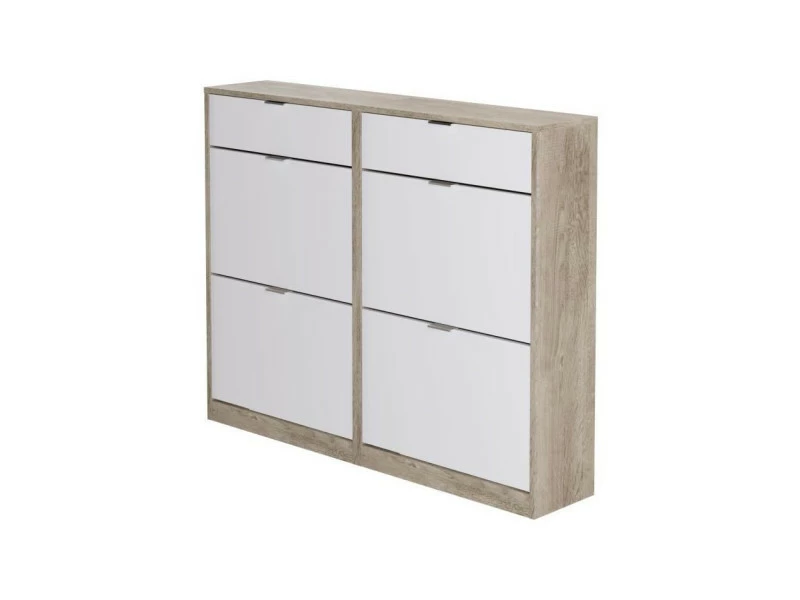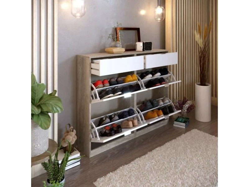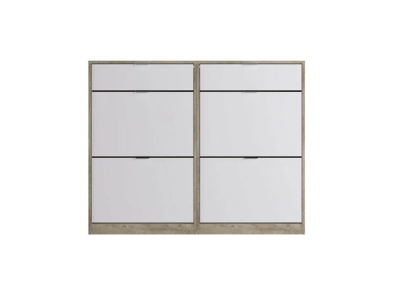 Meuble a chaussures avec 4 portes + 2 tiroirs fabriqué en melamine chene pour le corps du meuble et mélamine blanche pour les portes. Poignées en ABS gris. Capacité 24-28 pairs de chaussures.