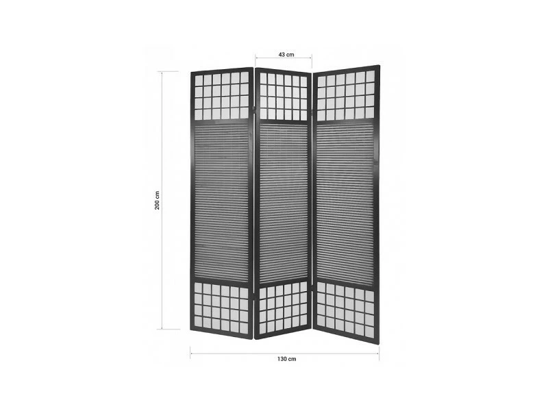 . Description du produit. Le paravent crée une atmosphère de bien-être dans chaque espace de vie grâce à sa belle apparence. L´atmosphère du paravent peut être complet en raison du tissu qui se trouve de chaque côté. Le hauban en bois décore également l´intérieur du paravent. Le produit n´a pas seulement un aspect original, mais a également un effet fonctionnel en séparant une pièce et lespace intime. Les charnières sont pliables dans les deux sens. Le diviseur de pièce peut être placé en fonction de vos besoins individuels. Si vous nen avez pas besoin, il peut être rabattu facilement.. Détails. 3-panneaux Paravent. pliant. charnière bidirectionnelle. Matériau et couleur. bois encadrement en brun foncé. papier de riz blanc et bambou. Dimensions. Hauteur: 200 cm. Largeur: 132 cm. Profondeur: 2,2 cm. Largeur par panneaux 44 cm. Livraison en France Métropolitaine Uniquement Hors Corse. Délai de livraison environ 15 jours