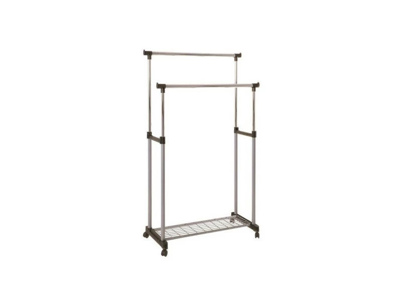 Portant double tres pratique en tube d’acier sur roulettes avec deux grandes tringles rĂ©glables en hauteur de 95 a 170 cm et grille porte chaussures. Dimensions : 95x43x170cm.