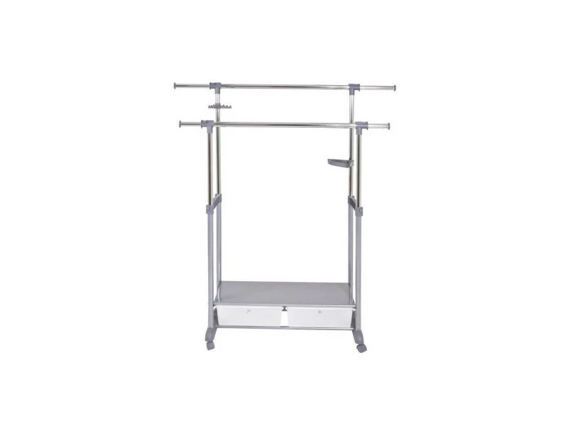 Portant Thomas 93 – Acier et plastique – 141x44x112 cm – 162 cm – Aluminium et chromé – Réglable en hauteur – 2 tiroirs – CrochetPortant Thomas 93 – Acier et plastique – 141x44x112 cm – 162 cm – Aluminium et chromé – Réglable en hauteur – 2 tiroirs – Crochet