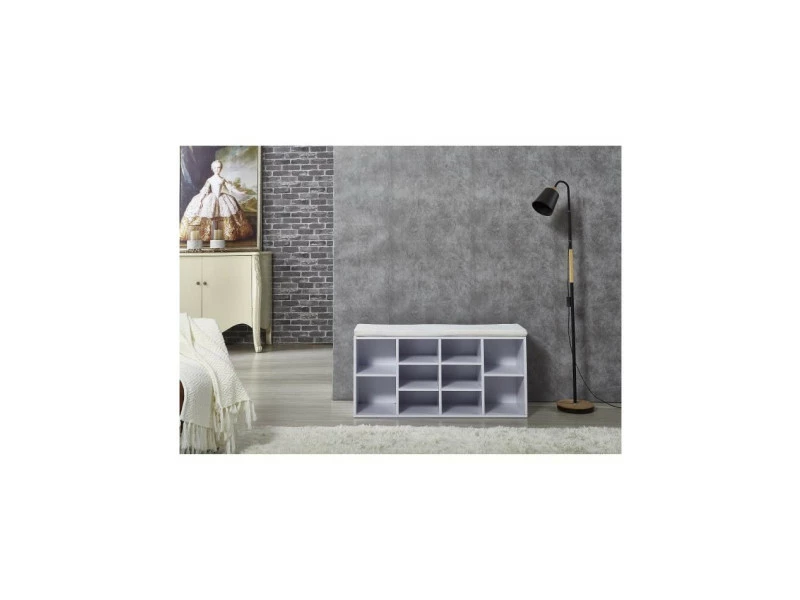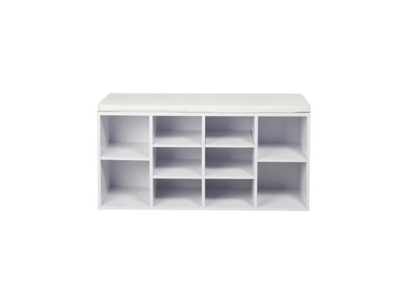SKARPA Meuble a chaussures en MDF mélaminé blanc – Style et design contemporain – 1 banc avec coussin revetement tissu blanc – 10 niches de rangements – Contenance 10 paires – Dimensions totales : L 100 x P 30 x H 46 cm.