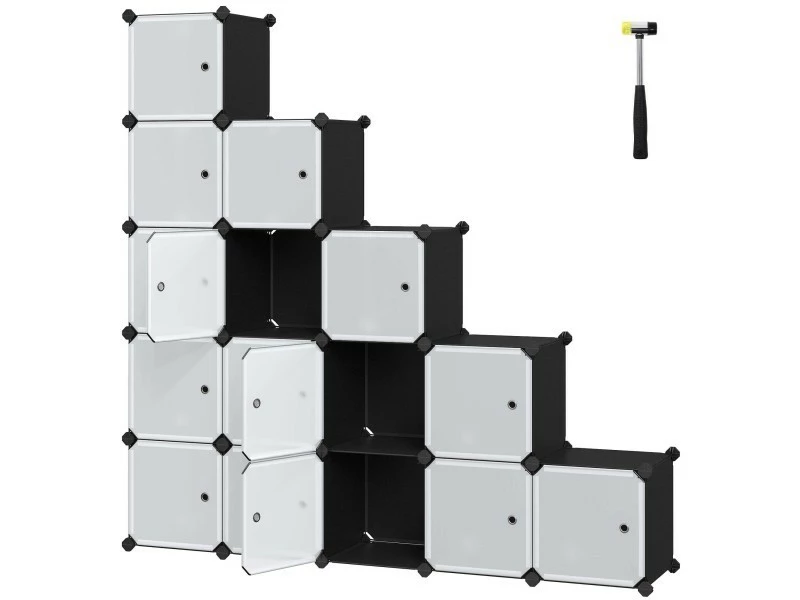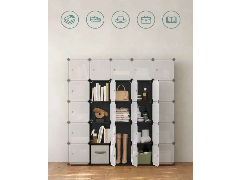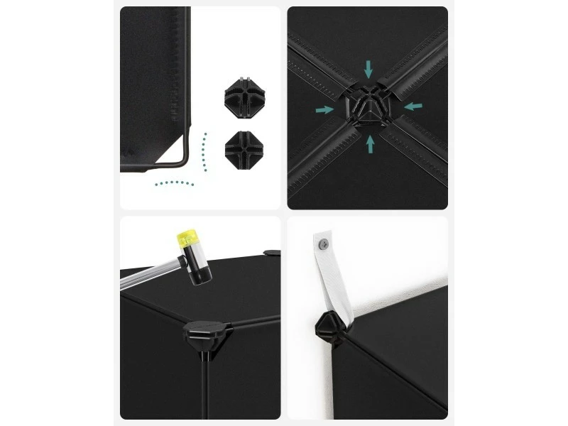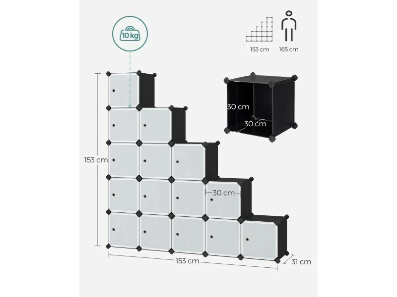 Stable, sécuritaire et durable : Grâce aux panneaux en plastique PP avec un cadre en tubes métalliques et aux connecteurs en plastique ABS très résistants, ce meuble supporte jusqu’à 10 kg/compartiment. Des dispositifs anti-basculement sont fournis pour assurer une utilisation sûre.