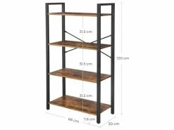 La bibliothèque de style rustique comporte 4 tablettes stables et spacieuses. Elle se caractĂ©rise par sa polyvalence et sa fonctionnalitĂ©, ce qui en fait un Ă©lĂ©ment parfait pour un salon, une chambre ou un bureau. Les tablettes ouvertes permettent d’accĂ©der facilement au contenu. La structure mĂ©tallique garantit la stabilitĂ© du meuble. La charge maximale par tablette est de 10 kg. La distance entre les tablettes est de 31.5 cm., POINTS FORTS: Style rustique, 4x tablette, Finition : tablettes en coloris marron rustique foncĂ©, cadre en coloris noir, Meuble fonctionnel Ă usage universel, Construction stable, CARACTÉRISTIQUES TECHNIQUES: Largeur 66 cm, Profondeur 30 cm, Hauteur 120 cm, MatĂ©riau : panneau de particules, mĂ©tal, Ă€ monter soi-mĂŞme, Photos des articles les plus fidèles possible, mais restant non contractuelles, les nuances de couleur et le rendu des matières prĂ©sentĂ©s Ă l’Ă©cran pouvant ĂŞtre diffĂ©rents de la rĂ©alitĂ©