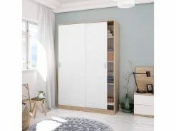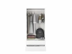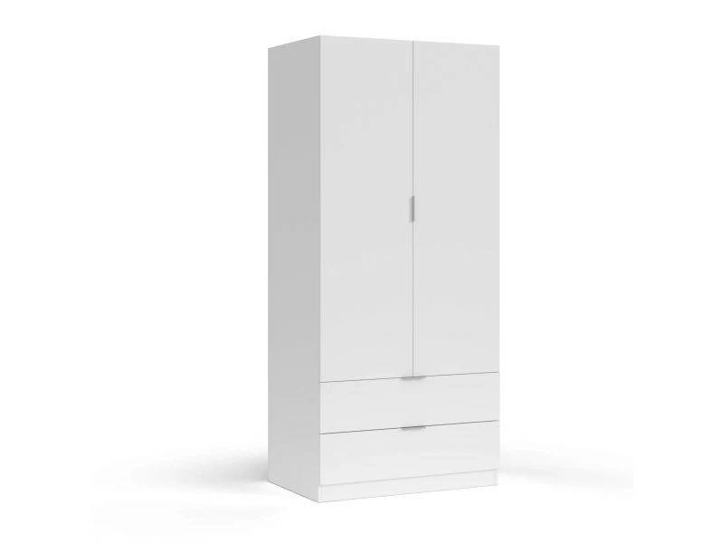Cette armoire est un atout idéal pour sublimer et aménager votre chambre grâce à sa structure en panneaux de particules qui lui assure une grande résistance dans le temps. Elle possède 2 portes battantes qui renferment un espace penderie avec barre pour suspendre tous les types de vêtements sur cintre. Chaque porte s’ouvre grâce à des petites poignées métalliques. Les 2 tiroirs situés en bas de l’armoire viennent compléter l’espace penderie en offrant du rangement supplémentaire.