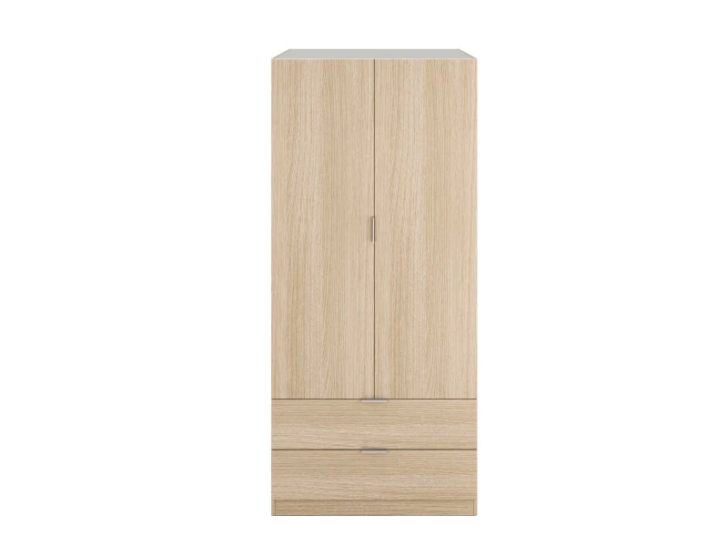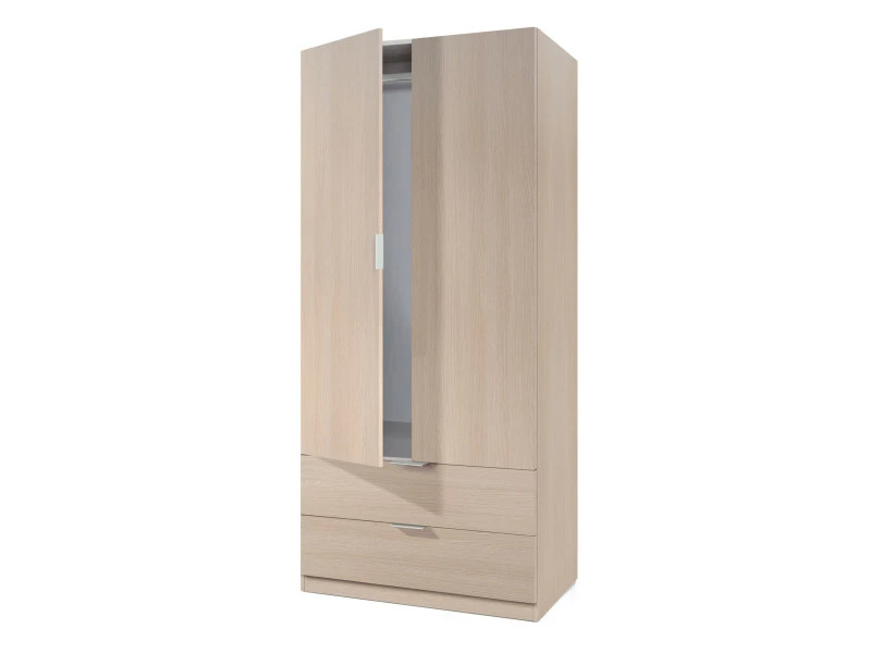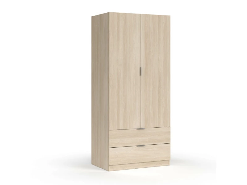 Cette armoire est un atout idéal pour sublimer et aménager votre chambre grâce à sa structure en panneaux de particules qui lui assure une grande résistance dans le temps. Elle possède 2 portes battantes qui renferment un espace penderie avec barre pour suspendre tous les types de vêtements sur cintre. Chaque porte s’ouvre grâce à des petites poignées métalliques. Les 2 tiroirs situés en bas de l’armoire viennent compléter l’espace penderie en offrant du rangement supplémentaire.