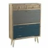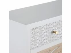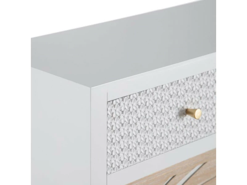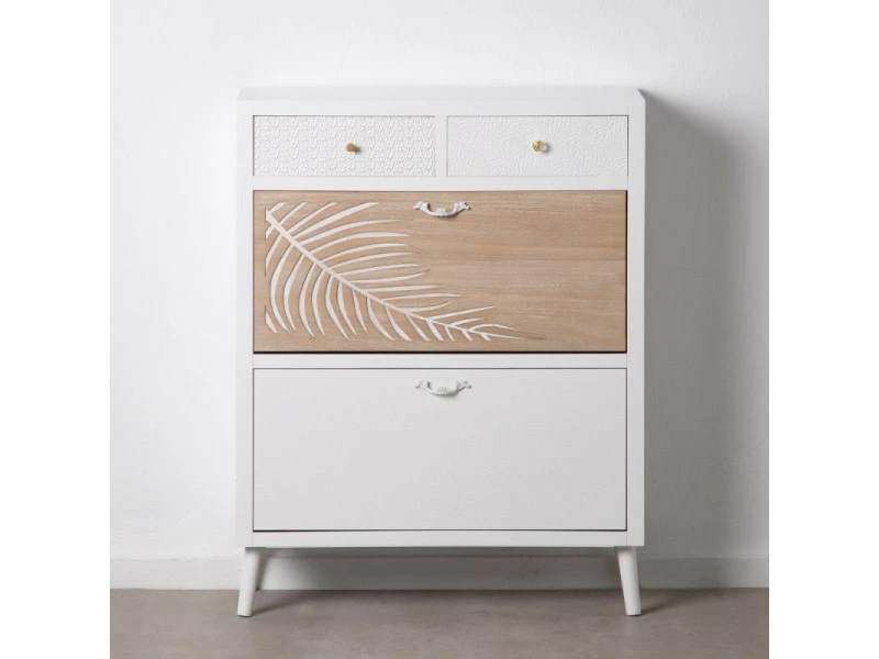 Vous apprécierez les façades de tiroirs aux motifs originaux sculptés ainsi que la quincaillerie fantaisie de ce meuble prévu pour loger 12 paires de chaussures.