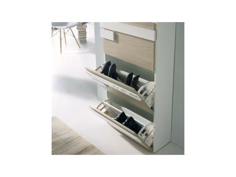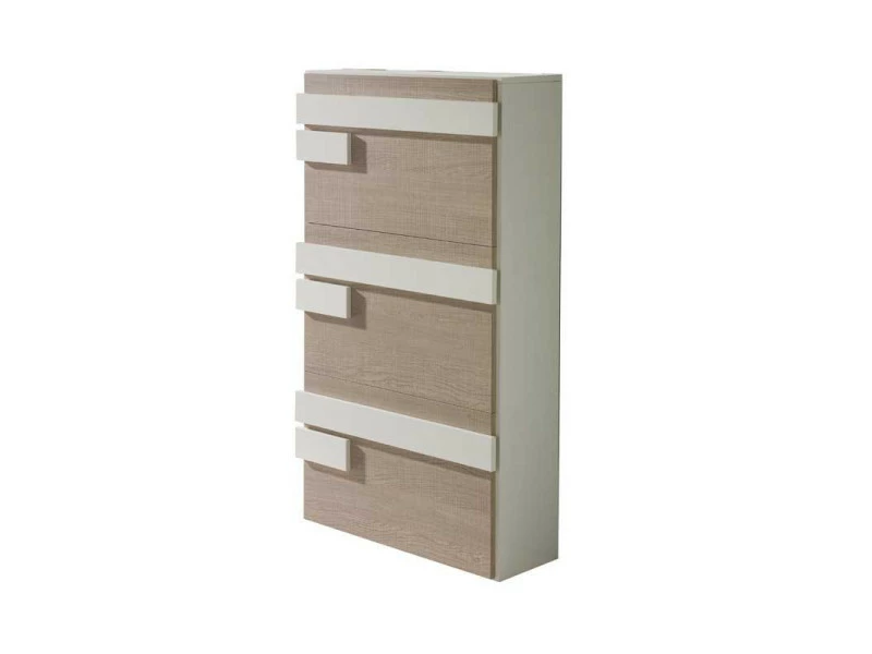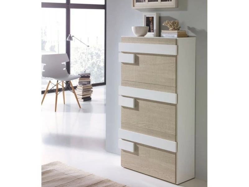 Meuble à chaussures 3 portes laqué blanc avec décor chêne clair qui vous permettra de ranger 12 à 18 paires de chaussures.