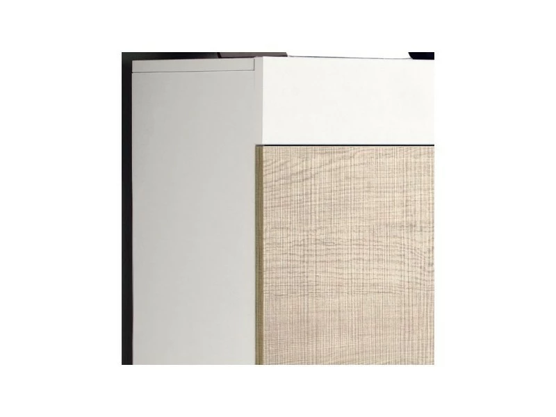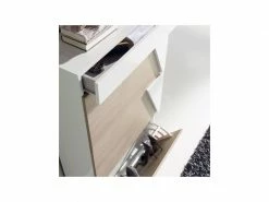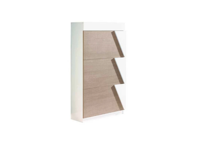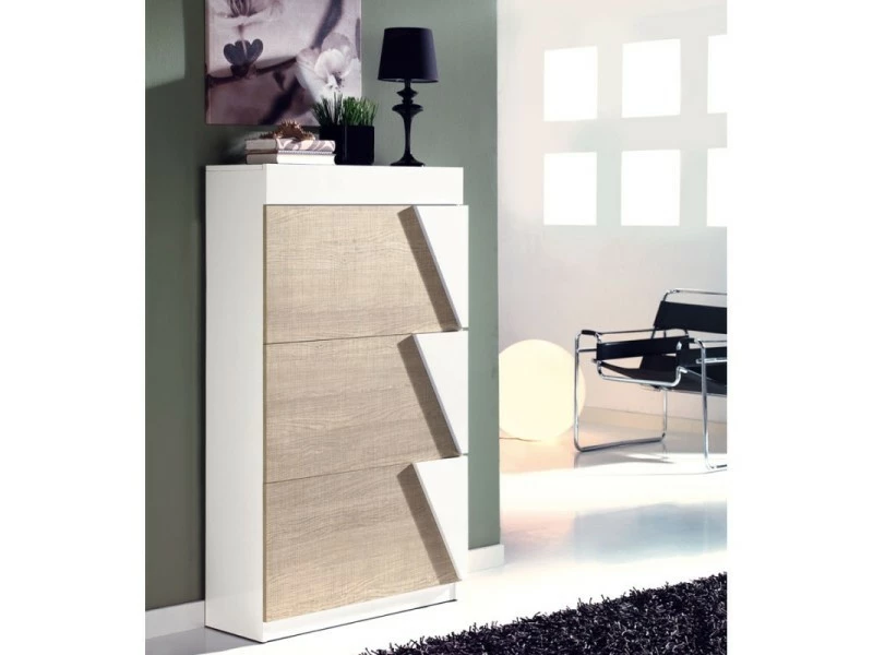 Meuble à chaussures trois compartiments laque blanche et décor chêne clair.