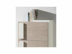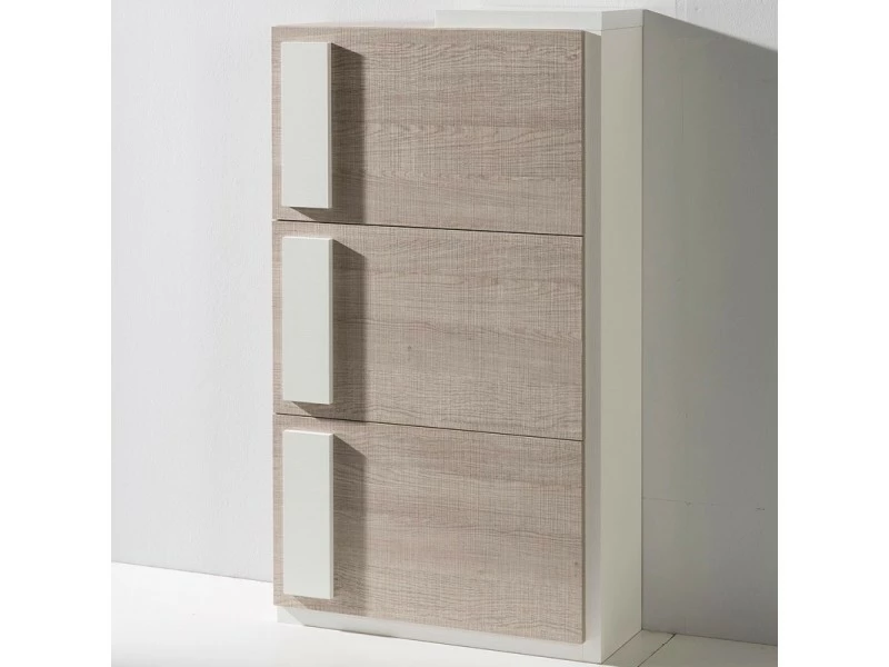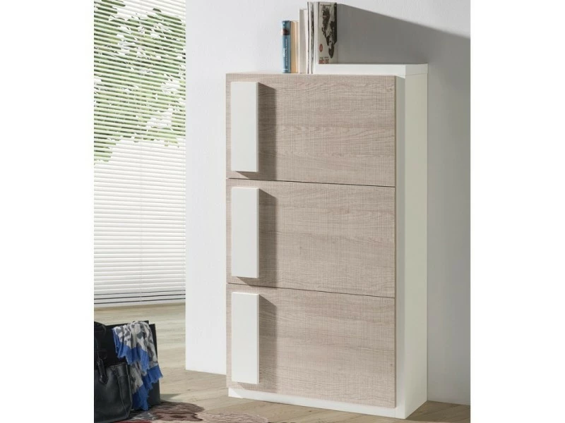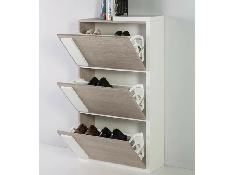 Meuble à chaussures trois abattantslaque blanche et décor chêne clair.