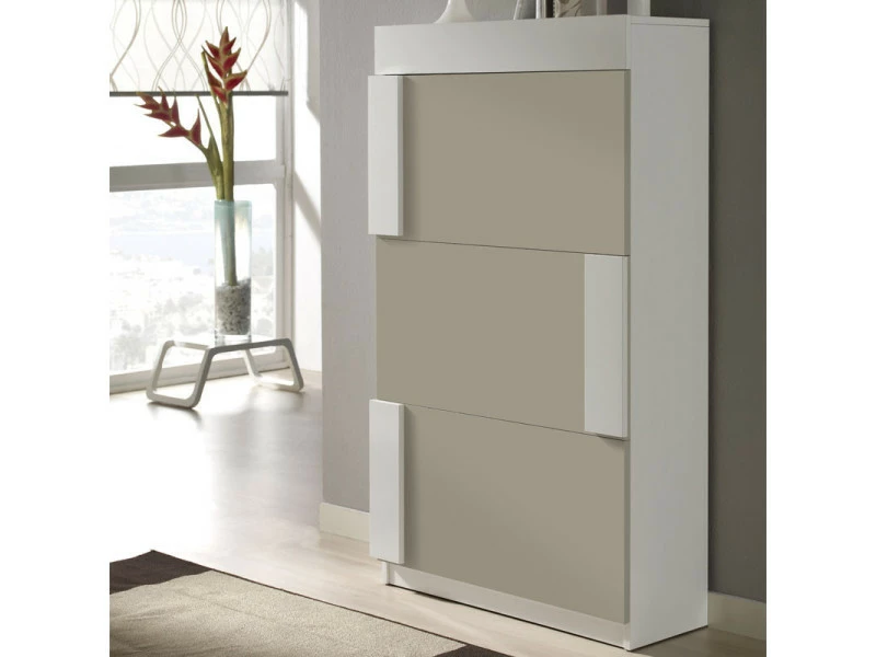 Meuble à chaussures trois compartiments laque blanche et crème.