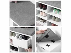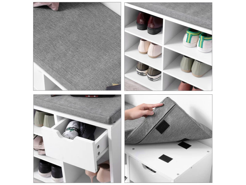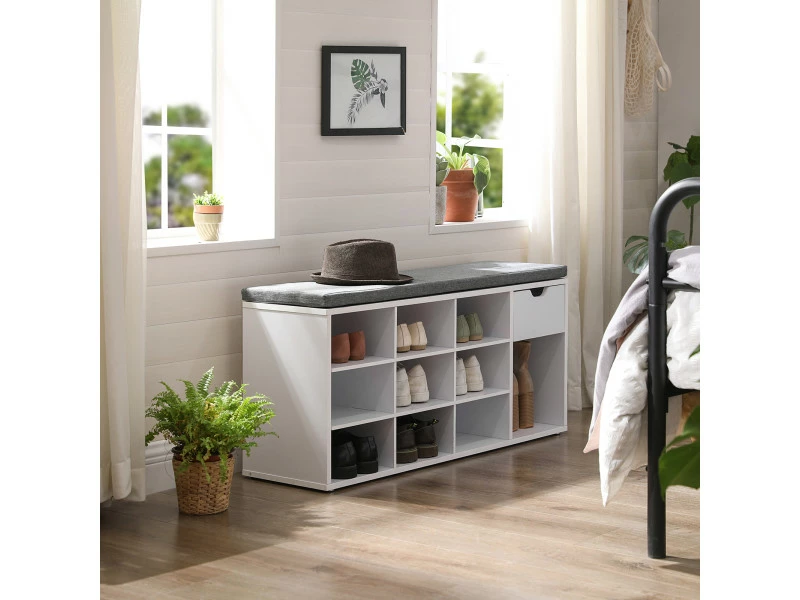 4. ASSEYEZ-VOUS À DEUX ! Asseyez-vous sur le banc pour mettre vos chaussures, vous et votre moitié ! Il mesure 100 cm de long, il est fait de panneaux de particules solides de qualité E1 et il possède un coussin en mousse confortable