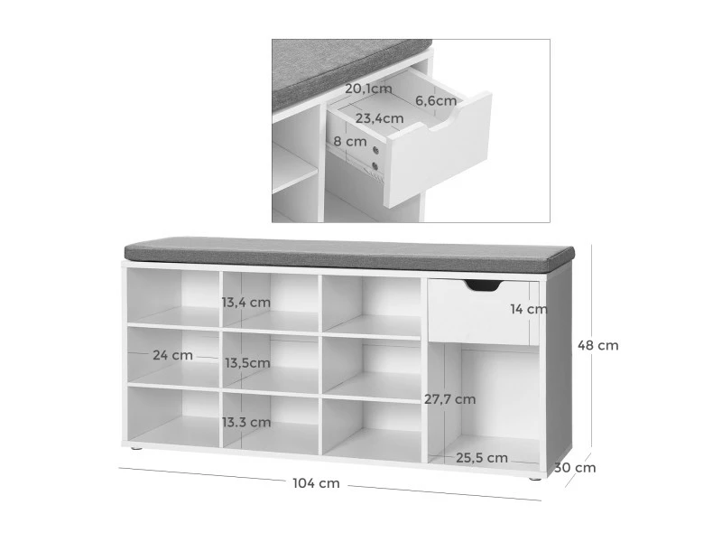 3. POUR LES GRANDS ET PETITS : Grâce aux compartiments ouverts, dont un plus grand, ce banc à chaussures vous permet de ranger des objets de différentes tailles : jouets, chaussures, boîtes de rangement… et même vos grandes bottes auront suffisamment de place !